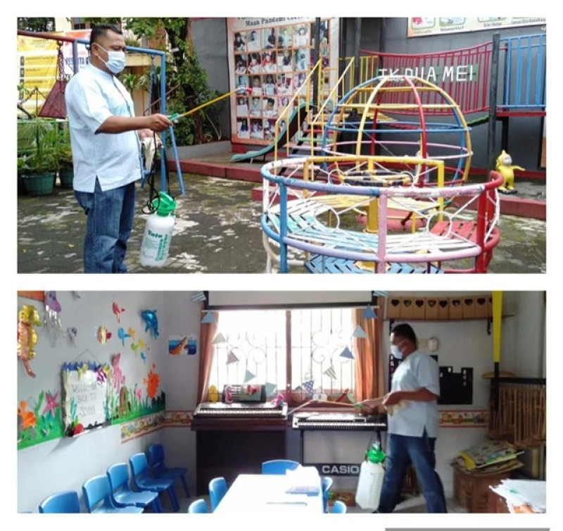 Gambar diatas adalah proses penyemprotan desinfektan di TK DUA MEI meliputi area bermain, ruang kelas, ruang musik dan ruang guru. Hal ini dilakukan karena Sekolah Dua Mei turut berupaya mencegah terjadinya penyebaran virus Covid-19.