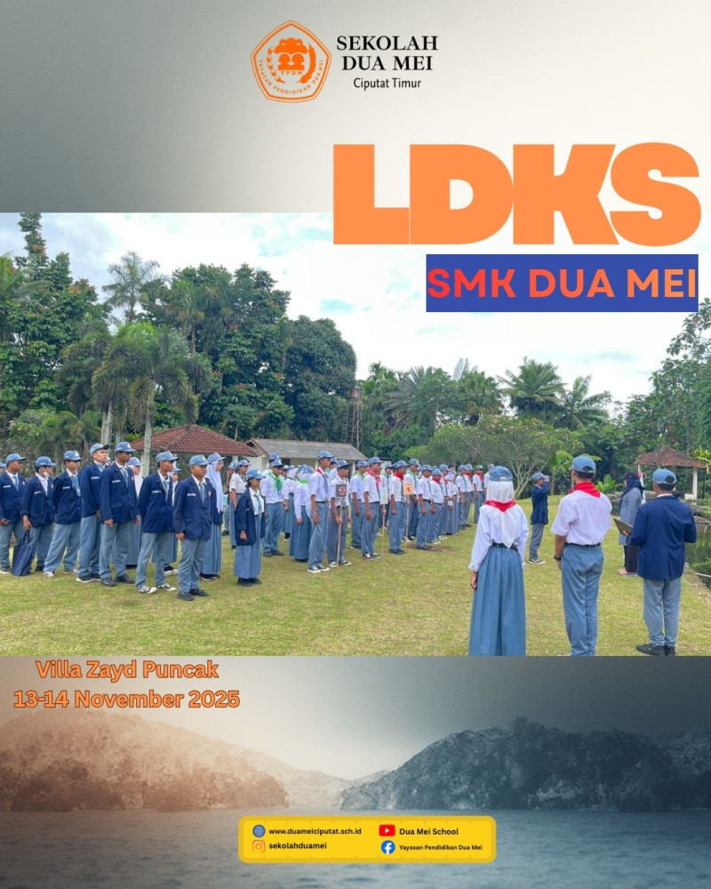 LDKS SMK Dua Mei dilaksanakan pada tanggal 13-14 November 2025 di Villa Zayd Puncak. Kegiatan Latihan Dasar Kepemimpinan ini bertujuan untuk melatih dan mengembangkan jiwa kepemimpinan, karakter, dan keterampilan manajerial siswa. Selain itu dilaksanakan serah terima jabatan pengurus OSIS periode 2024/2025 kepada pengurus OSIS periode 2025/2026. Pembekalan materi diberikan oleh guru pendamping antara lain, Manajemen Diri dan Tanggung jawab, Adab dan Etika Berorganisasi, serta Struktur Kepemimpinan. Diisi pula pertunjukan api unggun dan pertunjukan seni oleh masing-masing kelompok siswa. Dua Mei..! Jaya..! Jaya..! Jayaa..! #sekolahduamei #smkduamei #tangsel #tangerangselatan ✨TELAH DIBUKA PPDB 2026/2027✨